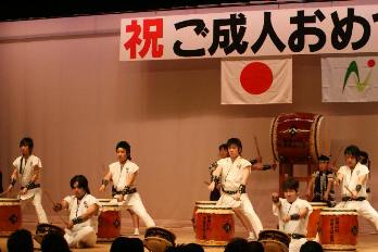 | 平成19年1月7日、旧小川町と旧馬頭町が合併して那珂川町となって2回目の成人式が行われ、次代を担う新成人たちに和太鼓でエールを贈った。「和太鼓の響きに感激した」と、新成人の声が私たちにも届き、今どきの若者たちが集う成人式に和太鼓がはたして合うのかどうか心配なところがあったが、ほっと胸をなでおろすと同時に嬉しさもこみ上げてきた演奏会だった。 まほろば太鼓打ち手の晴奈も新成人となり、演奏終了後、打ち手仲間から祝福を浴びた(なんのことはない、記念撮影をしただけ)。 |