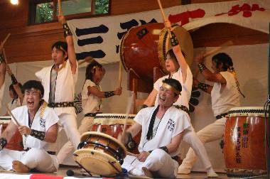 | 〔和太鼓E長調〕 中太鼓センターの辰則と同右の雅彰は名コンビです。 |