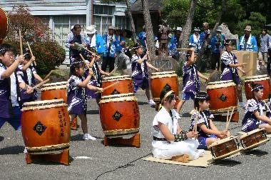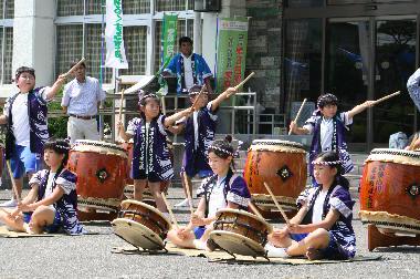 | 今年も“夏まつり山車巡行”が行われ、その出発式では、山車巡行の安全を祈願してまほろば子供太鼓の演奏が行われた。 助っ人のお兄さんお姉さんの3人を入れても14人と、子供太鼓にしては少人数だったが、お世辞抜きで出来が良く、しかも堂々の演奏振りで拍手喝采を浴びた。 |