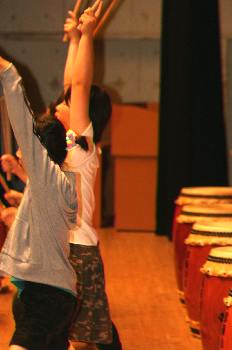| 〔和太鼓E長調〕 プログラムに載せておいたアンコール曲です。 1人だけ腕上げを忘れている人がいるようですね。 |