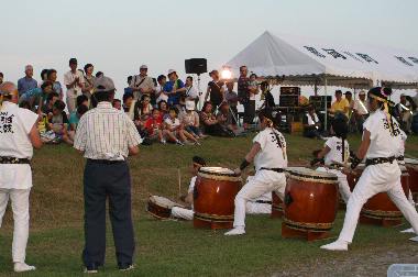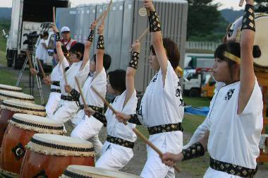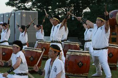 | 町村合併後4回目を数える「那珂川町夏まつり」が今年も開かれ、メインの「花火大会」に先駆けて、夕空の下、勇壮に太鼓を打ち鳴らした。 |