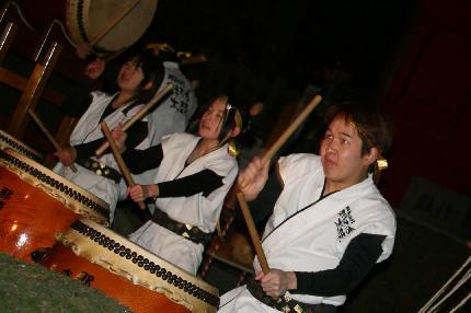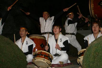 | 2009年12月31日、今年の大晦日も「まほろば太鼓桴の響演」で締めくくることができた。 恒例となりつつある(恒例となった?)那珂川町白久の長泉寺での演奏は、除夜の鐘の音とともに5回を数えた。 零下での演奏は、何年か前に住職から教えをいただいた『修行である』と心得ながら、ライトアップされた「三重の塔」の前で、厳かにも、最後は手拍子での演奏参加を強要するなど、観客を巻き込んで熱くあつく打ち終えることができた。 |