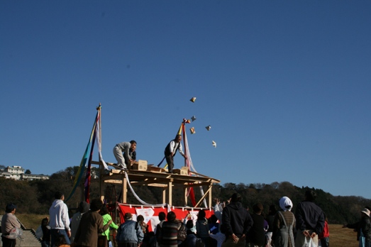 | 旧小川商工会主催で毎年行われていた「暮れ市」は、旧馬頭商工会との合併によりその存続が危ぶまれていたが、新たに那珂川町商工会主催で会場も那珂川町小川総合福祉センター「すこやか共生館」前広場に変更され引き続き開かれることになった。 暮れ市は、例年どおりフリーマーケットや焼きそば、甘酒の無料サービスのほか、仮設の家屋の屋根の上から上棟式を模した『がらまき』も行われ大いに賑わいをみせた。 まほろば太鼓も昨年に続き招かれ、眩しいくらいの青空の下、「Joyful Beat 〜祭音〜」を始め全4曲を打ち鳴らすことができた。 |