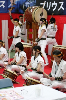 | 「春のカロフェスタ」と銘打ってトヨタカローラ栃木主催のお祭りがトヨタカローラ栃木西那須野店で開かれ、まほろば太鼓も2日目のイベントの一つとして演奏を披露した。 当日は暴風警報が発令されるという最悪の天候だったが、屋内ということもあって元気いっぱいに50分のステージを務めることができた。 |