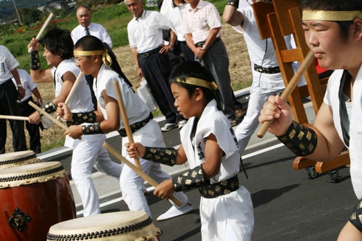 | 国道294号小川南バイパスの開通式が執り行われ、安全祈願祭、開通式典につづき、通り初め式に先駆けて太鼓を打ち鳴らした。 |