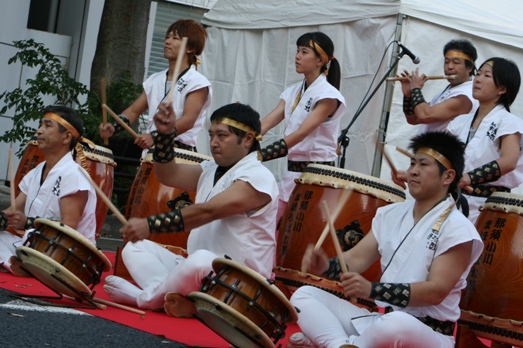 | 台風一過の爽やかな秋空の下、水戸市中心街を歩行者天国にして「第2回水戸まちなかフェスティバル」が開かれ、水戸藩!味な城下町まつり、水戸市商店会感謝フェスティバル、黄門さん・青空マーケット、ステージイベントなどなど盛り沢山の催しが行なわれた。 まほろば太鼓も昨年につづいて招かれ、たくさんのお客さんに囲まれながら元気いっぱい打ち鳴らすことができた。 |