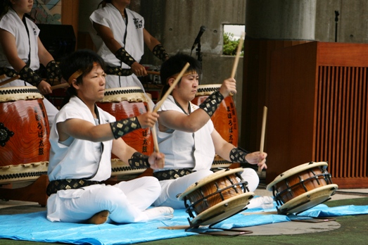 | 那珂川町青少年旅行村「グリーンヒル」野外ステージをメイン会場に「那珂川苑&グリーンヒルふれあい祭」&「馬頭温泉郷夕焼けコンサート」が行われ、まほろば太鼓もオープニングを飾る1stステージと午後の2ndステージの2回公演を行なった。 天気予報では「小雨のち曇り」だったが、我が増子保存会長が「晴れにしろ」って気象庁に電話したらしく、「うそー」って言うくらいに晴れ間も見える祭り日和となってしまい楽しいひと時を過ごすことができた。 |