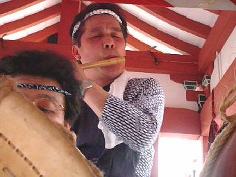 ![]() 70年(?)の年季が入ったお囃子です。 (地囃子保存会:手前から深沢さんと鈴木さん) |